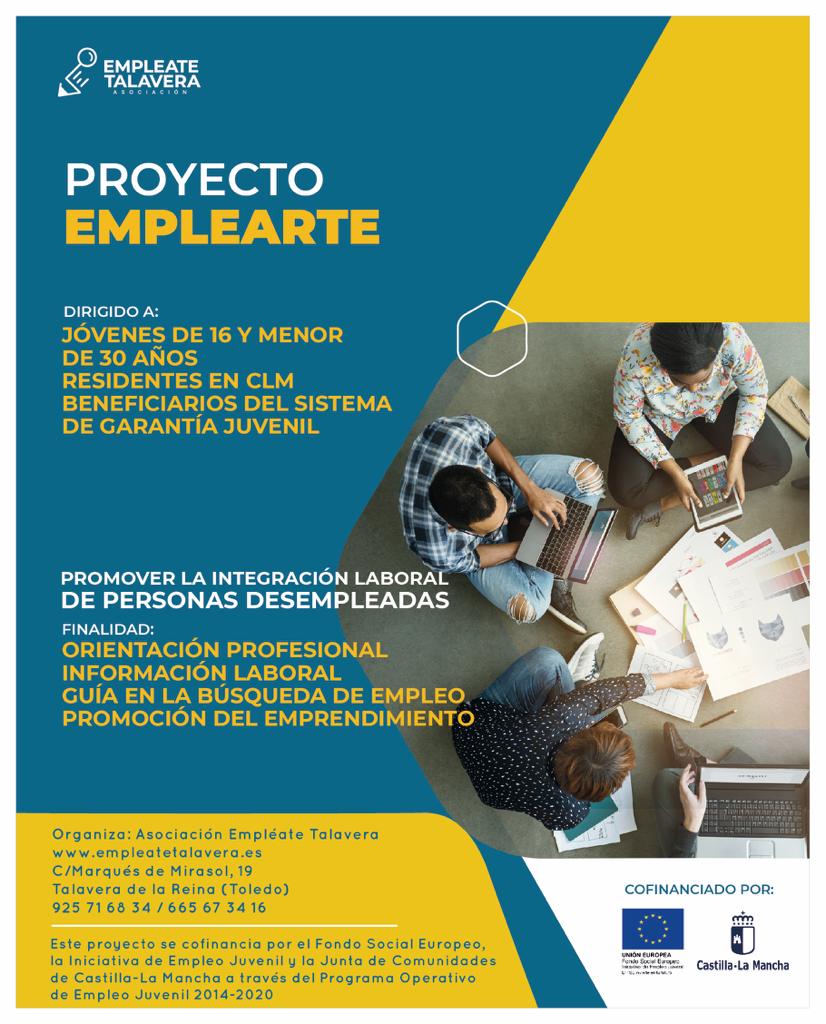 El Proyecto Emplearte es una iniciativa organizada por la Asociación Empléate Talavera, destinada a jóvenes de 16 a 29 años residentes en Castilla-La Mancha (CLM) y beneficiarios del Sistema de Garantía Juvenil. El objetivo principal es promover la integración laboral de personas desempleadas a través de diversas acciones.